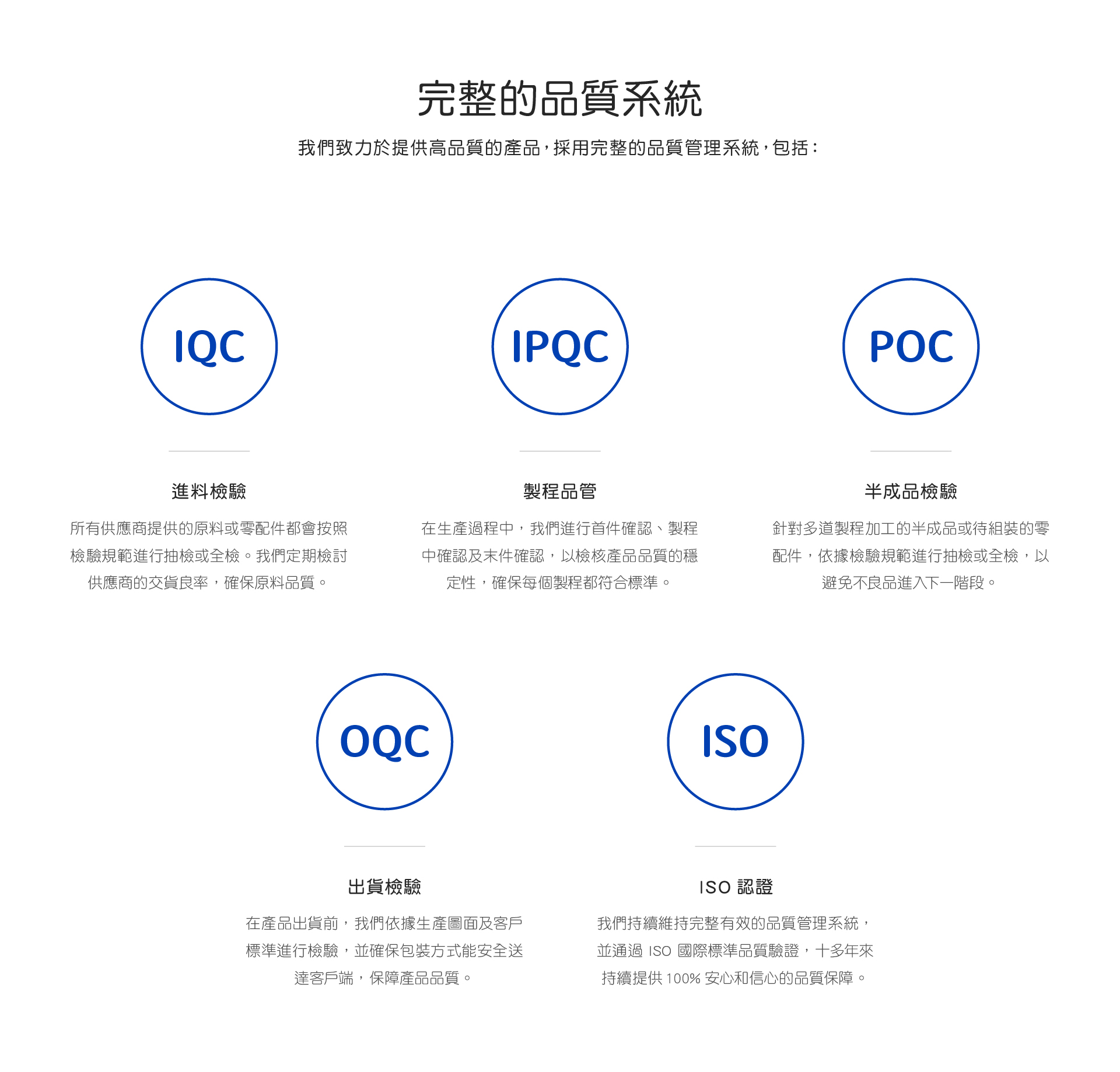 我們致力於提供高品質的產品,採用完整的品質管理系統,包括: